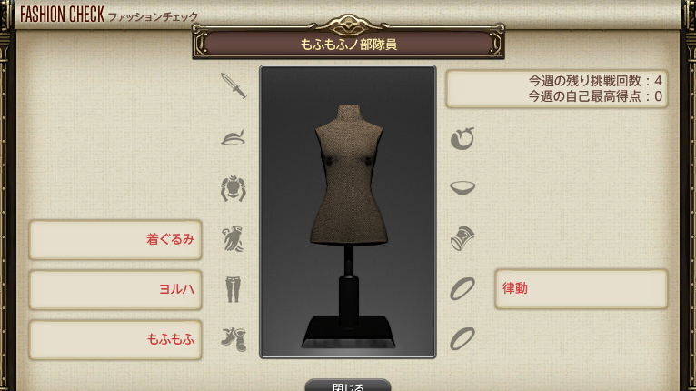 採点の際は何でもイイので、すべての装備枠を埋めて採点される必要があります。また、採点されると衣装はBINDされるので注意してください。