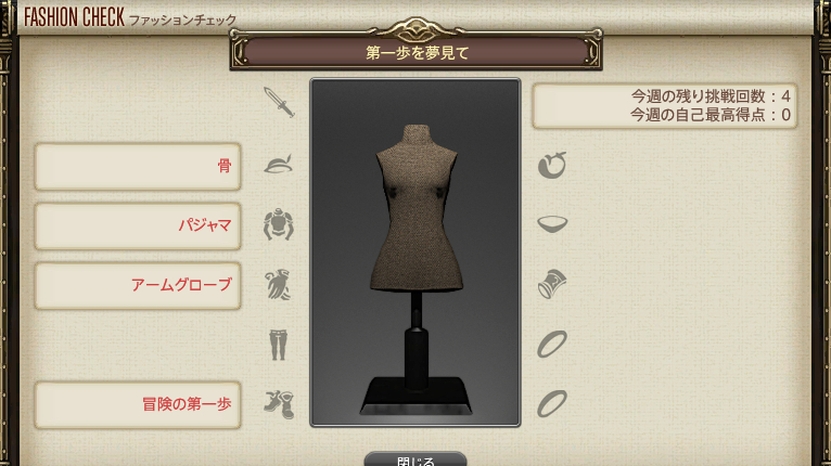 採点の際は何でもイイので、すべての装備枠を埋めて採点される必要があります。また、採点されると衣装はBINDされるので注意してください。