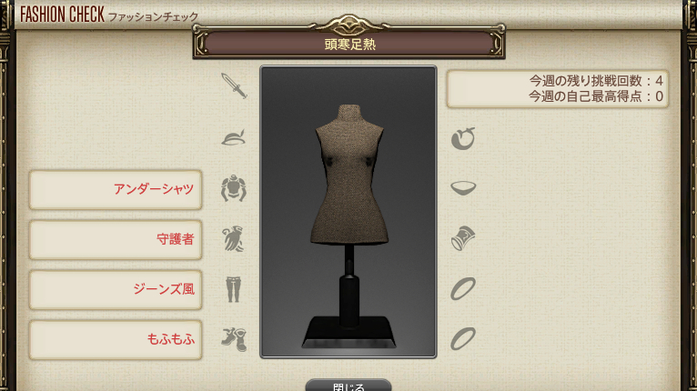 採点の際は何でもイイので、すべての装備枠を埋めて採点される必要があります。また、採点されると衣装はBINDされるので注意してください。